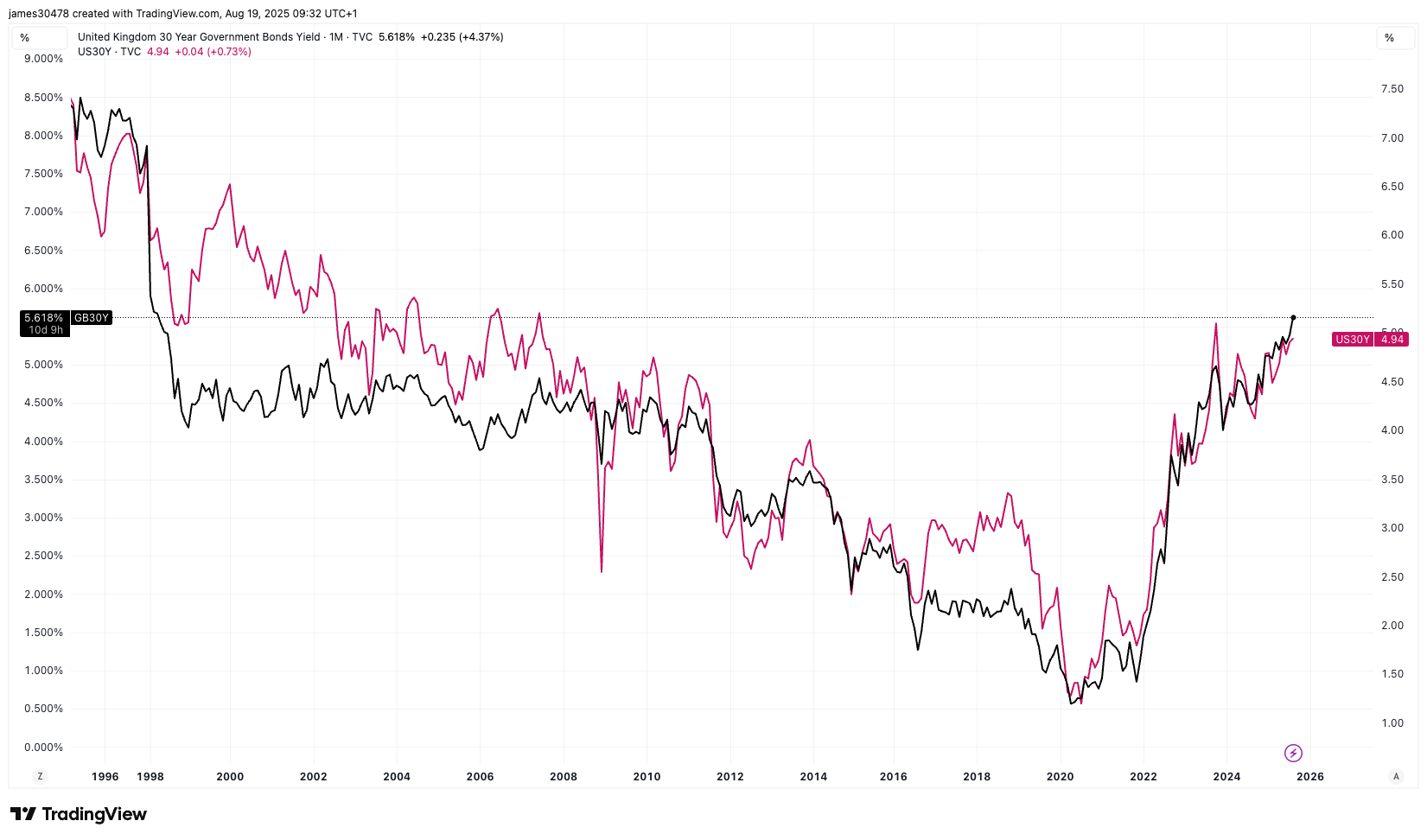 O título do governo do Reino Unido de 30 anos ofereceu um rendimento de 5,61% no horário da imprensa. São 68 pontos base mais do que o rendimento do Tesouro dos EUA de 30 anos, de acordo com a Data Source TradingView.