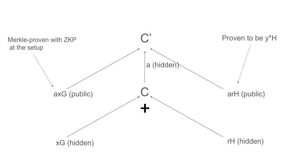 Se usarmos o protocolo Schnorr ou ECDSA para verificar a relação de (C’, C), um provador malicioso pode fazer C’ = yC e C = (bigX)G + rH onde y = ax/(bigX). yrH também será verificado.